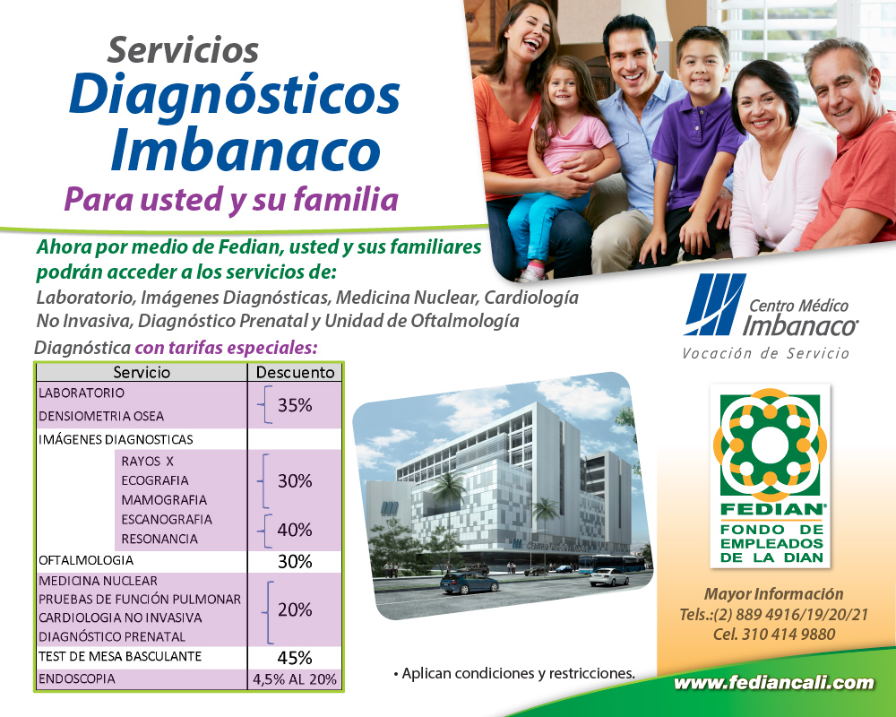 Ahora por medio de Fedian, usted y sus familiares podrán acceder a los servicios de: Laboratorio, Imágenes Diagnósticas, Medicina Nuclear, Cardiología No Invasiva, Diagnóstico Prenatal y Unidad de Oftalmología Diagnóstica con tarifas especiales, Consulta con especialistas con descuentos especiales
