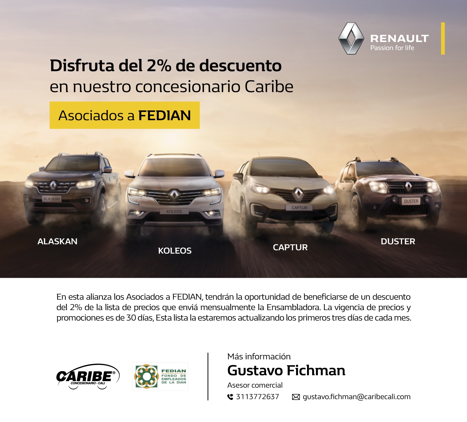Disfruta del 2% de descuento con nuestro nuevo convenio Caribe Renault y Fedian.